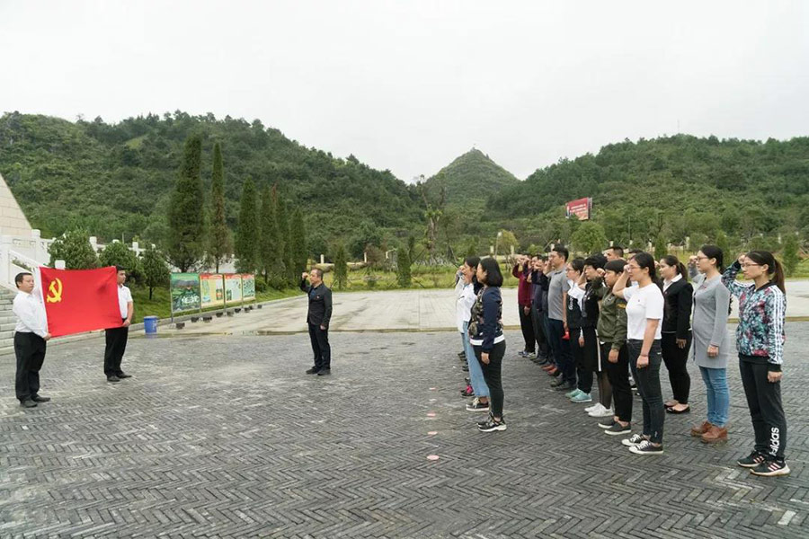隨后,全體黨員來(lái)到湘江戰(zhàn)役新圩阻擊戰(zhàn)酒海井紅軍紀(jì)念園,學(xué)習(xí)了解了紅軍突破湘江的歷史。兩名黨員代表為烈士敬獻(xiàn)了花圈,覃正東、周道林整理挽聯(lián),祭奠烈士英靈,全體黨員向革命烈士行三鞠躬禮,緬懷先烈,寄托哀思。最后,全體黨員在黨支部書(shū)記周道林的帶領(lǐng)下重溫入黨誓詞。