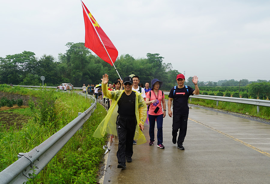 上午11點,同志們乘車到達全州縣紹水鎮(zhèn)下宅村,整裝齊隊,高舉黨旗,踏上了尋訪當年紅軍長征足跡,緬懷革命先烈的紅色之旅。行進中,天空下著瓢潑大雨,同志們一邊行軍,一邊唱紅歌,一邊品讀著紅軍長征的艱辛。