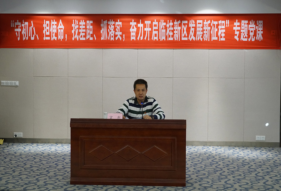 11月4日,按照主題教育安排部署,臨桂新區(qū)工委委員、管委會副主任文杰以“守初心、擔(dān)使命,找差距、抓落實,奮力開啟臨桂新區(qū)發(fā)展新征程”為主題,為新城投資集團全體黨員、積極分子、中層副職以上干部上了一堂專題黨課。