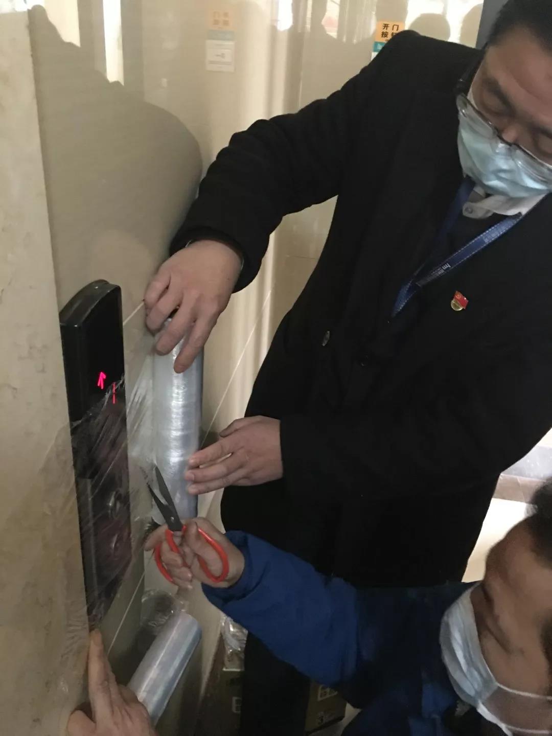 ▲周成同志與同事正在給入戶門對講系統(tǒng)及電梯按鍵貼上保鮮膜。