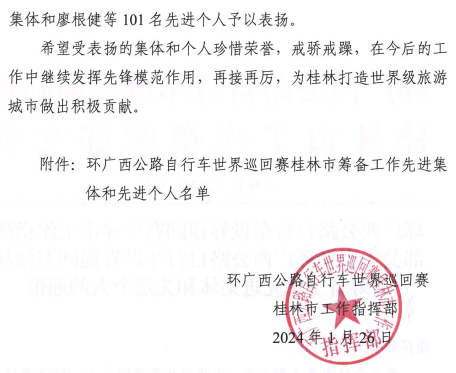 近日,根據(jù)《環(huán)廣西公路自行車(chē)世界巡回賽桂林市工作指揮部關(guān)于表?yè)P(yáng)環(huán)廣西公路自行車(chē)世界巡回賽桂林市籌備工作先進(jìn)集體和先進(jìn)個(gè)人的通報(bào)》(市環(huán)指[2024]1號(hào))獲悉,新城投集團(tuán)下屬宏謀物業(yè)公司李楓彥同志獲環(huán)廣西公路自行車(chē)世界巡回賽桂林市籌備工作先進(jìn)個(gè)人。